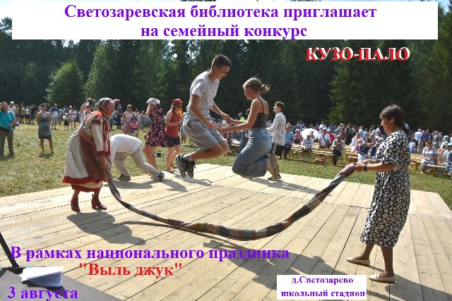 Опубликовано в АНОНСЫ СЕМЕЙНЫЙ КОНКУРС “КУЗО-ПАЛО” Опубликовал iazasniall Опубликовано на 18.07.2024 3 августа Светозаревская СБФ В рамках удмуртского национального праздника “Выль джук” Приглашает принять участие в семейном конкурсе. Автор: iazasniall