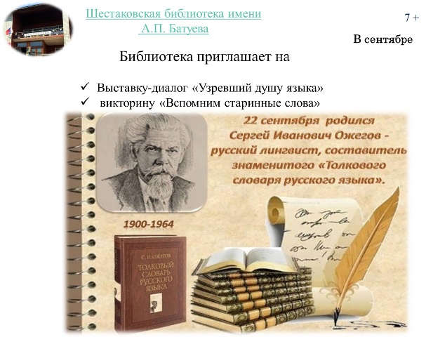 Опубликовано в АНОНСЫ Выставка-диалог “Узревший душу языка” Опубликовал iazasniall Опубликовано на 02.09.2025 В сентябре Шестаковская библиотека имени А.П. Батуева Приглашает на выставку-диалог. Автор: iazasniall