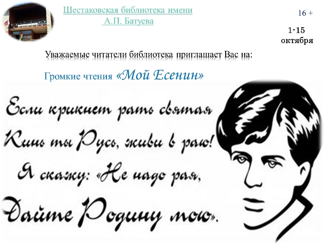 Опубликовано в АНОНСЫ ГРОМКИЕ ЧТЕНИЯ “МОЙ ЕСЕНИН” Опубликовал iazasniall Опубликовано на 01.10.2025 С 01 по 15 октября Шестаковская библиотека имени А.П. Батуева Приглашает принять участие в громких чтениях. Автор: iazasniall