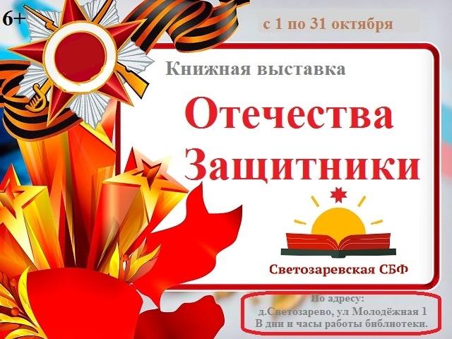 Опубликовано в АНОНСЫ КНИЖНАЯ ВЫСТАВКА «ОТЕЧЕСТВА ЗАЩИТНИКИ» Опубликовал iazasniall Опубликовано на 02.10.2025 С 01 по 31 октября Светозаревская СБФ Приглашает на книжную выставку. Автор: iazasniall