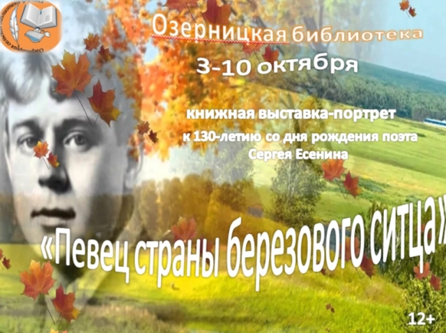 Опубликовано в АНОНСЫ КНИЖНАЯ ВЫСТАВКА-ПОРТРЕТ «ПЕВЕЦ СТРАНЫ БЕРЕЗОВОГО СИТЦА» Опубликовал iazasniall Опубликовано на 02.10.2025 С 03 по 10 октября Озерницкая-Библиотека Приглашает на книжную выставку. Автор: iazasniall
