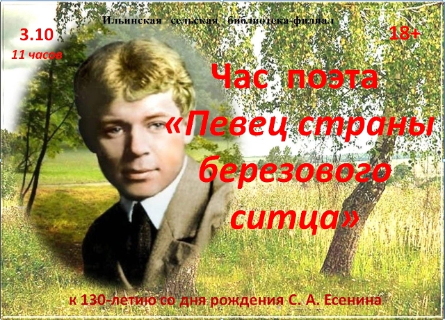 Опубликовано в АНОНСЫ ЧАС ПОЭТА «ПЕВЕЦ СТРАНЫ БЕРЕЗОВОГО СИТЦА» Опубликовал iazasniall Опубликовано на 02.10.2025 03 октября в 11-00 Ильинская сельская библиотека Приглашает на час поэта. Автор: iazasniall