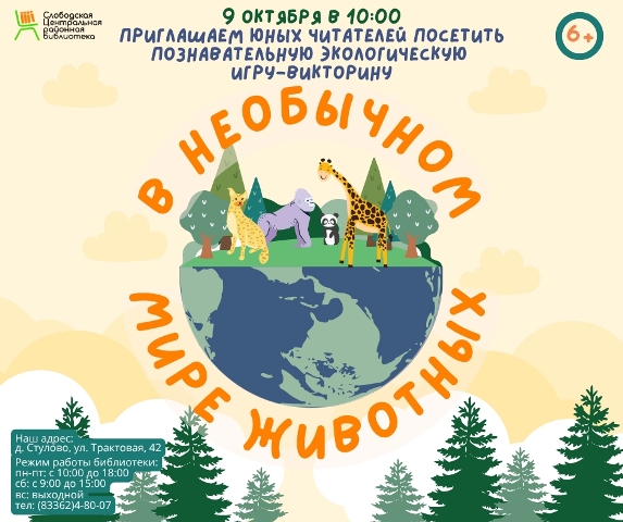 Опубликовано в АНОНСЫ ИГРА-ВИКТОРИНА “В НЕОБЫЧНОМ МИРЕ ЖИВОТНЫХ” Опубликовал iazasniall Опубликовано на 06.10.2025 09 октября в 10-00 Центральная районная библиотека Приглашает на игру-викторину. Автор: iazasniall