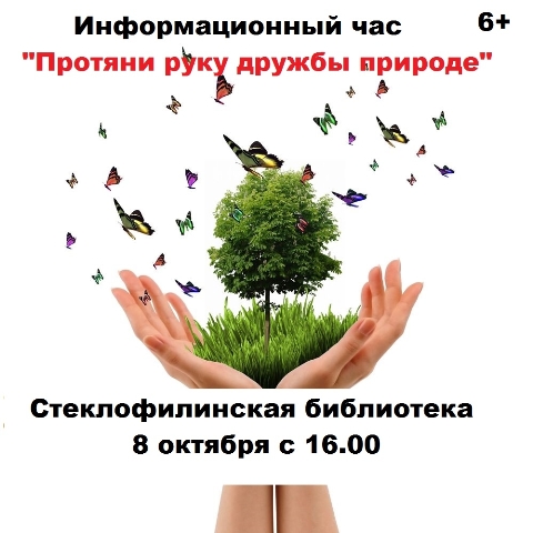 Опубликовано в АНОНСЫ ИНФОРМАЦИОННЫЙ ЧАС “ПРОТЯНИ РУКУ ДРУЖБЫ ПРИРОДЕ” Опубликовал iazasniall Опубликовано на 06.10.2025 08 октября в 16-00 Стеклофилинская библиотека Приглашает на информационный час. Автор: iazasniall