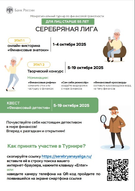 Опубликовано в Новости МЕЖРЕГИОНАЛЬНЫЙ ТУРНИР ПО ФИНАНСОВОЙ ГРАМОТНОСТИ Опубликовал iazasniall Опубликовано на 06.10.2025 Банк России проводит Межрегиональный турнир по финансовой грамотности для лиц старше 55 лет! Автор: iazasniall