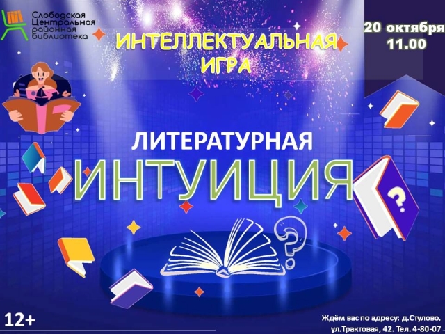 Опубликовано в АНОНСЫ ИНТЕЛЛЕКТУАЛЬНАЯ ИГРА «ЛИТЕРАТУРНАЯ ИНТУИЦИЯ» Опубликовал iazasniall Опубликовано на 17.10.2025 20 октября в 11-00 Центральная районная библиотека Приглашает на интеллектуальную игру. Автор: iazasniall