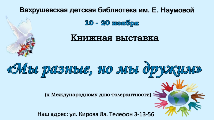 Опубликовано в АНОНСЫ КНИЖНАЯ ВЫСТАВКА «МЫ РАЗНЫЕ, НО МЫ ДРУЖИМ» Опубликовал iazasniall Опубликовано на 10.11.2025 С 10 по 20 ноября Вахрушевская детская библиотека им. Е. Наумовой Приглашает на книжную выставку. Автор: iazasniall
