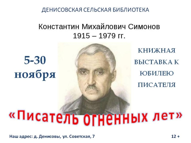 Опубликовано в АНОНСЫ КНИЖНАЯ ВЫСТАВКА «ПИСАТЕЛЬ ОГНЕННЫХ ЛЕТ» Опубликовал iazasniall Опубликовано на 10.11.2025 С 05 по 30 ноября Денисовская библиотека Приглашает на книжную выставку. Автор: iazasniall