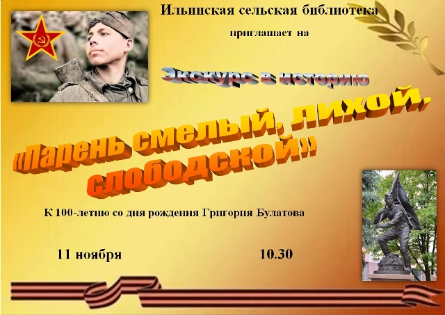 Опубликовано в АНОНСЫ ЭКСКУРС В ИСТОРИЮ «ПАРЕНЬ СМЕЛЫЙ, ЛИХОЙ, СЛОБОДСКОЙ» Опубликовал iazasniall Опубликовано на 10.11.2025 11 ноября в 10-30 Ильинская сельская библиотека Приглашает на экскурс в историю. Автор: iazasniall