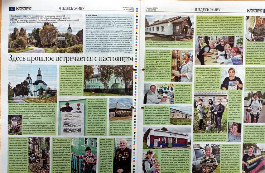 Вачевских, Н. «Здесь прошлое встречается с настоящим» : [«Слободские куранты» продолжают рассказывать о достопримечательностях и жителях Слободского района. В 2025 году читатели узнали о селе Волково благодаря экскурсии.] / Н. Вачевских // Слободские куранты. – 2025. – 7 ноября (№ 45). – С. 6, 7.