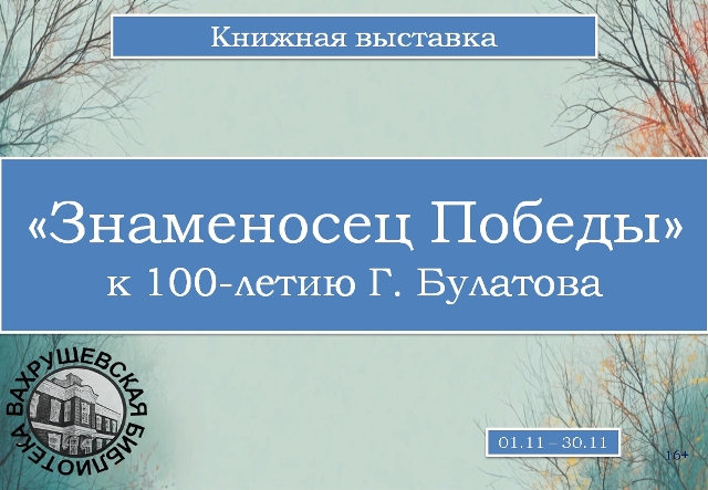 Опубликовано в АНОНСЫ КНИЖНАЯ ВЫСТАВКА «ЗНАМЕНОСЕЦ ПОБЕДЫ» Опубликовал iazasniall Опубликовано на 12.11.2025 С 01 по 30 ноября Вахрушевская городская библиотека-филиал Приглашает на книжную выставку. Автор: iazasniall