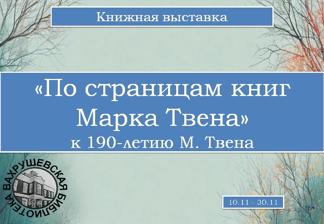 Опубликовано в АНОНСЫ КНИЖНАЯ ВЫСТАВКА «ПО СТРАНИЦАМ КНИГ МАРКА ТВЕНА» Опубликовал iazasniall Опубликовано на 12.11.2025 С 10 по 30 ноября Вахрушевская городская библиотека-филиал Приглашает на книжную выставку. Автор: iazasniall