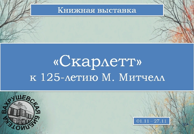 Опубликовано в АНОНСЫ КНИЖНАЯ ВЫСТАВКА «СКАРЛЕТТ» Опубликовал iazasniall Опубликовано на 12.11.2025 С 01 по 27 ноября Вахрушевская городская библиотека-филиал Приглашает на книжную выставку. Автор: iazasniall