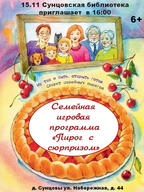 Опубликовано в АНОНСЫ СЕМЕЙНАЯ ИГРОВАЯ ПРОГРАММА «ПИРОГ С СЮРПРИЗОМ» Опубликовал iazasniall Опубликовано на 12.11.2025 15 ноября в 16-00 Сунцовская СБФ Приглашает на семейную игровую программу. Автор: iazasniall