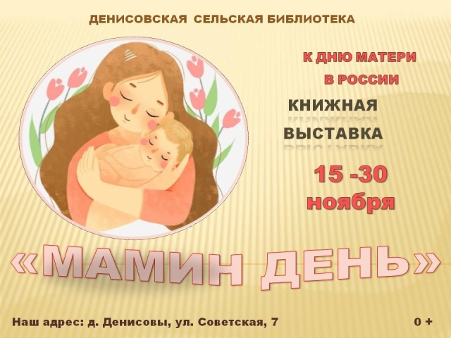 Опубликовано в АНОНСЫ КНИЖНАЯ ВЫСТАВКА «МАМИН ДЕНЬ» Опубликовал iazasniall Опубликовано на 14.11.2025 С 15 по 30 ноября Денисовская библиотека Приглашает на книжную выставку. Автор: iazasniall