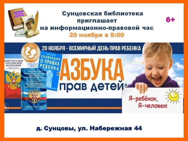 Опубликовано в АНОНСЫ ИНФОРМАЦИОННО-ПРАВОВОЙ ЧАС «АЗБУКА ПРАВ ДЕТЕЙ» Опубликовал iazasniall Опубликовано на 17.11.2025 20 ноября в 09-00 Центральная районная библиотека Приглашает на информационно-правовой час. Автор: iazasniall