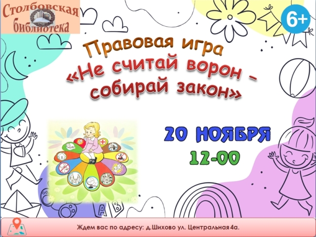 Опубликовано в АНОНСЫ, Новости ПРАВОВАЯ ИГРА «НЕ СЧИТАЙ ВОРОН — СОБИРАЙ ЗАКОН» Опубликовал iazasniall Опубликовано на 17.11.2025 20 ноября в 12-00 Столбовская СБФ Приглашает на правовую игру. Автор: iazasniall