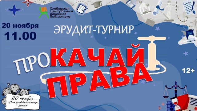 Опубликовано в АНОНСЫ ЭРУДИТ — ТУРНИР «ПРОКАЧАЙ ПРАВА» Опубликовал iazasniall Опубликовано на 17.11.2025 20 ноября в 11-00 Центральная районная библиотека Приглашает на эрудит — турнир. Автор: iazasniall