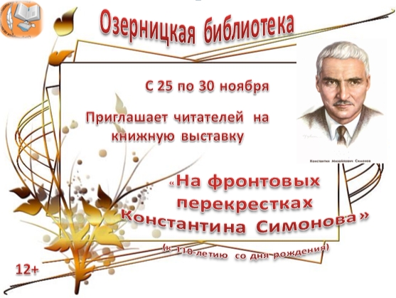 Опубликовано в АНОНСЫ КНИЖНАЯ ВЫСТАВКА «НА ФРОНТОВЫХ ПЕРЕКРЕСТКАХ КОНСТАНТИНА СИМОНОВА» Опубликовал iazasniall Опубликовано на 24.11.2025 С 25 по 30 ноября Озерницкая-Библиотека П-Центральный Приглашает на книжную выставку. Автор: iazasniall