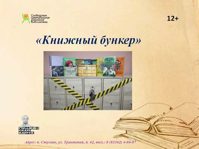С 09.12.2025 года Центральная районная библиотека приглашает организованные группы по «Пушкинской карте» на квест «Книжный бункер». Захватывающая, удивительная книжная квест-игра. В финале мероприятия участники найдут ключ от абонемента и смогут покинуть книжный зал. А вы готовы пройти испытание?