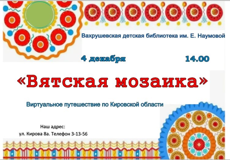 Опубликовано в АНОНСЫ ВИРТУАЛЬНОЕ ПУТЕШЕСТВИЕ ПО КИРОВСКОЙ ОБЛАСТИ «ВЯТСКАЯ МОЗАИКА» Опубликовал iazasniall Опубликовано на 02.12.2025 04 декабря в 14-00 Вахрушевская ДБФ Приглашает в виртуальное путешествие. Автор: iazasniall