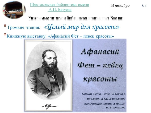 Опубликовано в АНОНСЫ ГРОМКИЕ ЧТЕНИЯ «ЦЕЛЫЙ МИР ДЛЯ КРАСОТЫ» Опубликовал iazasniall Опубликовано на 03.12.2025 В декабре Шестаковская библиотека имени А.П. Батуева Приглашает на громкие чтения. Автор: iazasniall