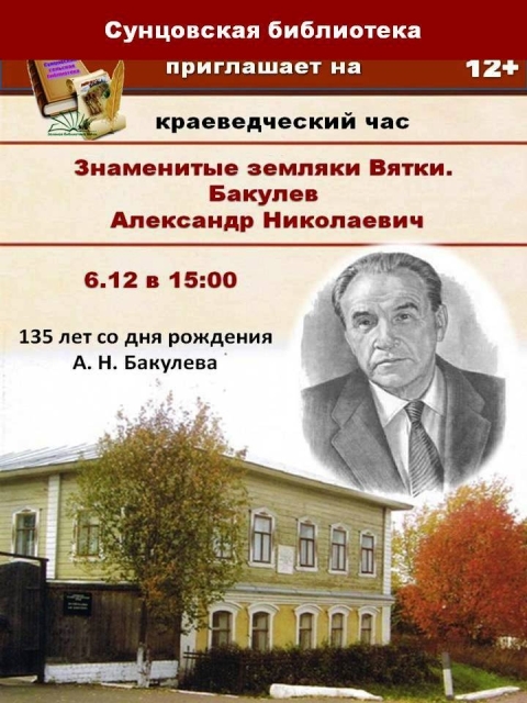 Опубликовано в АНОНСЫ КРАЕВЕДЧЕСКИЙ ЧАС «ЗНАМЕНИТЫЕ ЗЕМЛЯКИ ВЯТКИ.БАКУЛЕВ АЛЕКСАНДР НИКОЛАЕВИЧ» Опубликовал iazasniall Опубликовано на 03.12.2025 6 декабря в 16-00 Сунцовская СБФ Приглашает на краеведческий час. Автор: iazasniall