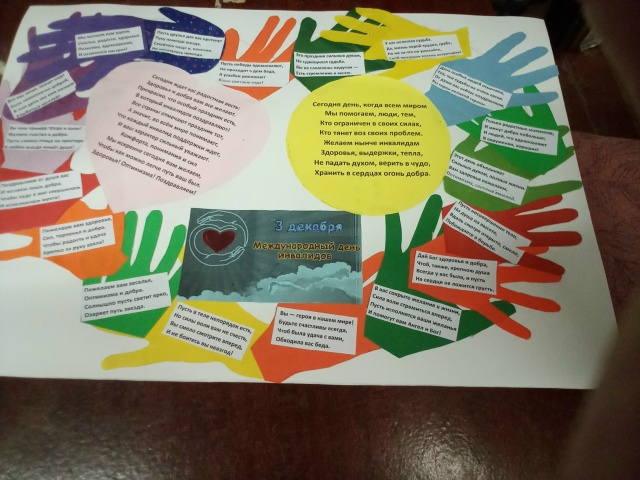 В рамках реализации проекта осуществляется организация и проведение библиотечных мероприятий, сбор информации об интересующих людей с ОВЗ книгах, подбор и выдача литературы по интересуемой особыми людьми тематика. Участниками данного проекта являются также проживающие Каринского Дома-интерната. В этом году к проекту присоединился коллектив педагогов и школьников Светозаревской школы. К праздничному дню школьники начальных классов под руководством наставников-старшеклассников и классного руководителя подготовили поздравительные стихотворения, которые были размещены на вырезанных из бумаги разноцветных ладошках. Участники школьного Медиацетра изготовили поздравительную стенгазету, собрав эти ладошки в форме сердечка. Данная коллективная работа будет передана в Каринский Дом-интернат.