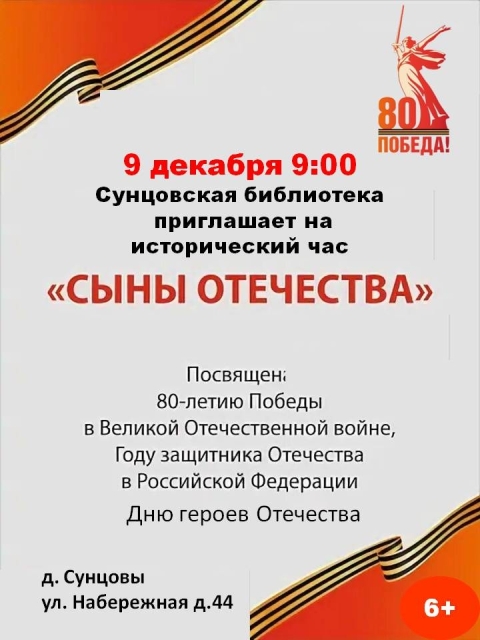 Опубликовано в АНОНСЫ ИСТОРИЧЕСКИЙ ЧАС «СЫНЫ ОТЕЧЕСТВА» Опубликовал iazasniall Опубликовано на 05.12.2025 09 декабря в 09-00 Сунцовская СБФ Приглашает на исторический час. Автор: iazasniall