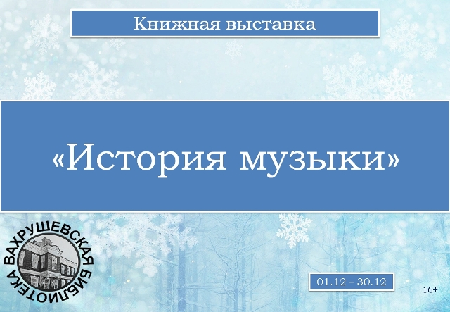 Опубликовано в АНОНСЫ КНИЖНАЯ ВЫСТАВКА «ИСТОРИЯ МУЗЫКИ» Опубликовал iazasniall Опубликовано на 08.12.2025 С 01 по 30 декабря Вахрушевская городская библиотека-филиал Приглашает на книжную выставку. Автор: iazasniall