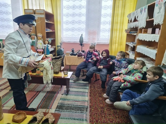 Занятие кружка «Дорогою добра» на тему «Вятская ярмарка» началось в музее села Совье. Ведущая в образе коробейника рассказала о быте крестьян, о проведении ярмарок, познакомила с изделиями вятских народных промыслов. Дети с удовольствием ходили в лаптях, разглядывали игрушки, посуду из дерева, бересты, корня, рассматривали полотенца, кружева. Затем отгадывали вятские загадки о предметах, с которыми познакомились. В конце занятия лепили из пластилина матрёшек.