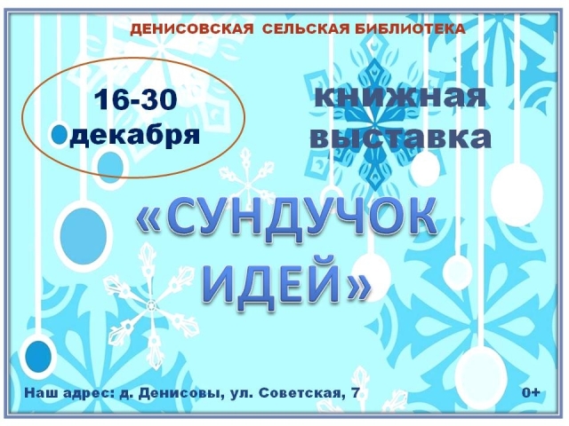 Опубликовано в АНОНСЫ КНИЖНАЯ ВЫСТАВКА «СУНДУЧОК ИДЕЙ» Опубликовал iazasniall Опубликовано на 12.12.2025 С 16 по 30 декабря Денисовская библиотека Приглашает на книжную выставку. Автор: iazasniall