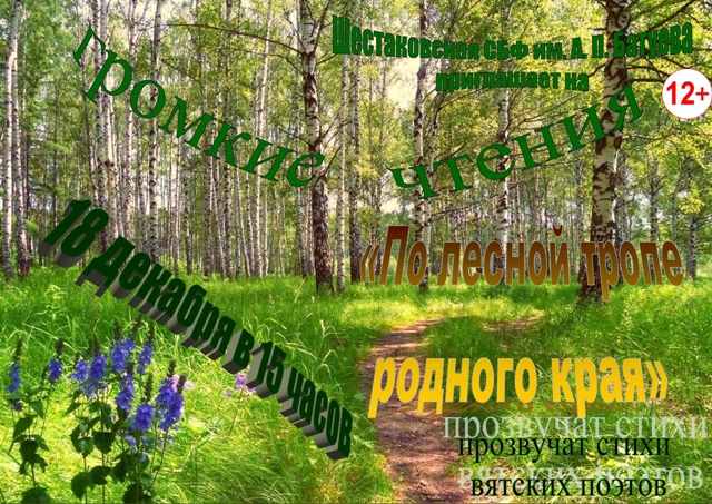 Опубликовано в АНОНСЫ ГРОМКИЕ ЧТЕНИЯ «ПО ЛЕСНОЙ ТРОПЕ РОДНОГО КРАЯ» Опубликовал iazasniall Опубликовано на 15.12.2025 18 ДЕКАБРЯ В 15-00 Шестаковская библиотека имени А.П. Батуева Приглашает на громкие чтения. Автор: iazasniall