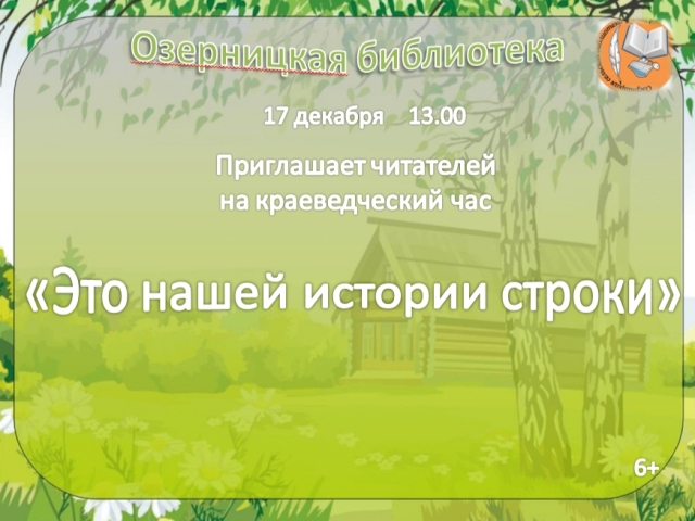 Опубликовано в АНОНСЫ КРАЕВЕДЧЕСКИЙ ЧАС «ЭТО НАШЕЙ ИСТОРИИ СТРОКИ» Опубликовал iazasniall Опубликовано на 15.12.2025 17 декабря в 13-00 Озерницкая-Библиотека Приглашает на краеведческий час. Автор: iazasniall