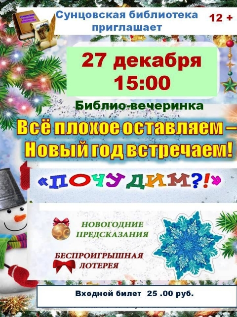 Опубликовано в АНОНСЫ БИБЛИО-ВЕЧЕРИНКА «ВСЕ ПЛОХОЕ ОСТАВЛЯЕМ — НОВЫЙ ГОД ВСТРЕЧАЕМ!» Опубликовал iazasniall Опубликовано на 24.12.2025 27 декабря в 15-00 Сунцовская СБФ Приглашает на библио-вечеринку. Автор: iazasniall