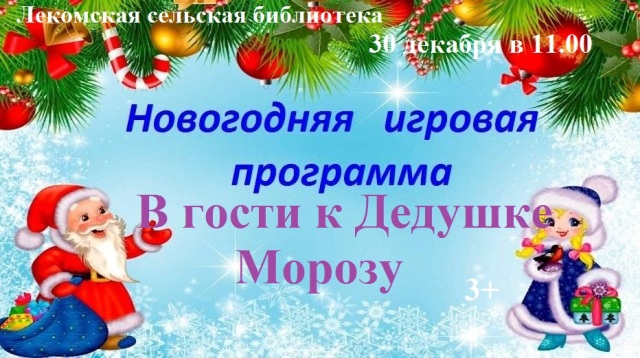 Опубликовано в АНОНСЫ НОВОГОДНЯЯ ИГРОВАЯ ПРОГРАММА «В ГОСТИ К ДЕДУШКЕ МОРОЗУ» Опубликовал iazasniall Опубликовано на 26.12.2025 30 декабря в 11-00 Лекомская библиотека Приглашает на новогоднюю игровую программу. Автор: iazasniall