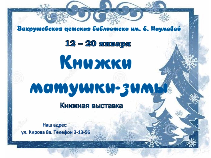 Опубликовано в АНОНСЫ КНИЖНАЯ ВЫСТАВКА «КНИЖКИ МАТУШКИ-ЗИМЫ» Опубликовал iazasniall Опубликовано на 12.01.2026 С 12 по 20 января Вахрушевская-Детская-Библиотека Приглашает на книжную выставку. Автор: iazasniall