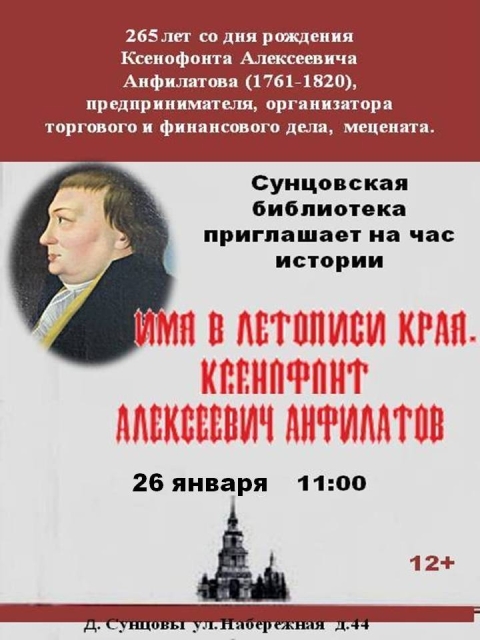 Опубликовано в АНОНСЫ ЧАС ИСТОРИИ «ИМЯ В ЛЕТОПИСИ КРАЯ. КСЕНОФОНТ АЛЕКСЕЕВИЧ АНФИЛАТОВ» Опубликовал iazasniall Опубликовано на 23.01.2026 26 января в 11-00 Сунцовская СБФ Приглашает на час истории. Автор: iazasniall