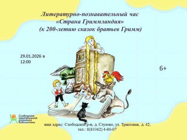 Опубликовано в АНОНСЫ ЛИТЕРАТУРНО-ПОЗНАВАТЕЛЬНЫЙ ЧАС «СТРАНА ГРИММЛАНДИЯ» Опубликовал iazasniall Опубликовано на 27.01.2026 29 января в 12-00 Слободская Центральная районная библиотека Приглашает на литературно-познавательный час. Автор: iazasniall
