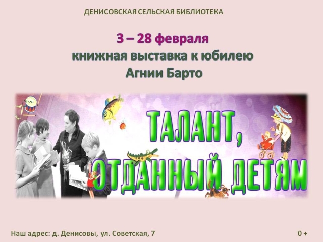 Опубликовано в АНОНСЫ КНИЖНАЯ ВЫСТАВКА К ЮБИЛЕЮ АГНИИ БАРТО «ТАЛАНТ, ОТДАННЫЙ ДЕТЯМ» Опубликовал iazasniall Опубликовано на 03.02.2026 С 03 по 28 февраля Денисовская СБФ Приглашает на книжную выставку. Автор: iazasniall