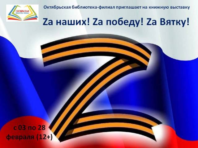 Опубликовано в АНОНСЫ КНИЖНАЯ ВЫСТАВКА «ЗА НАШИХ! ЗА ПОБЕДУ! ЗА ВЯТКУ!» Опубликовал iazasniall Опубликовано на 04.02.2026 С 03 по 28 февраля Октябрьская СБФ Приглашает на книжную выставку. Автор: iazasniall