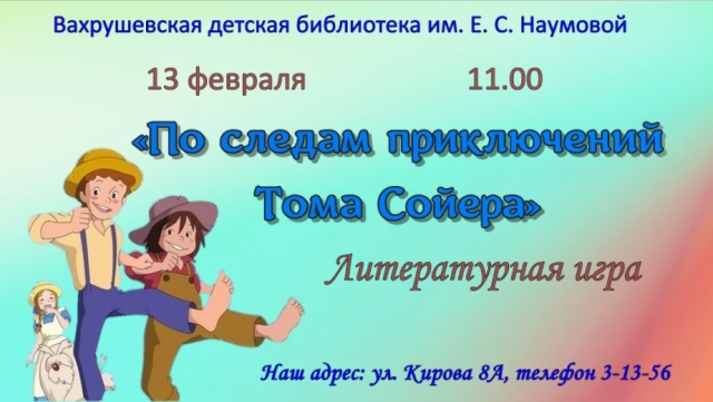 Опубликовано в АНОНСЫ ЛИТЕРАТУРНАЯ ИГРА «ПО СЛЕДАМ ПРИКЛЮЧЕНИЙ ТОМА СОЙЕРА» Опубликовал iazasniall Опубликовано на 10.02.2026 13 февраля в 11-00 Вахрушевская ДБФ Приглашает на литературную игру. Автор: iazasniall
