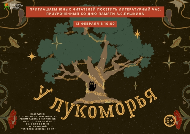 Опубликовано в АНОНСЫ ЛИТЕРАТУРНЫЙ ЧАС «У ЛУКОМОРЬЯ» Опубликовал iazasniall Опубликовано на 10.02.2026 13 февраля в 10-00 Центральная районная библиотека Приглашает на литературный час. Автор: iazasniall