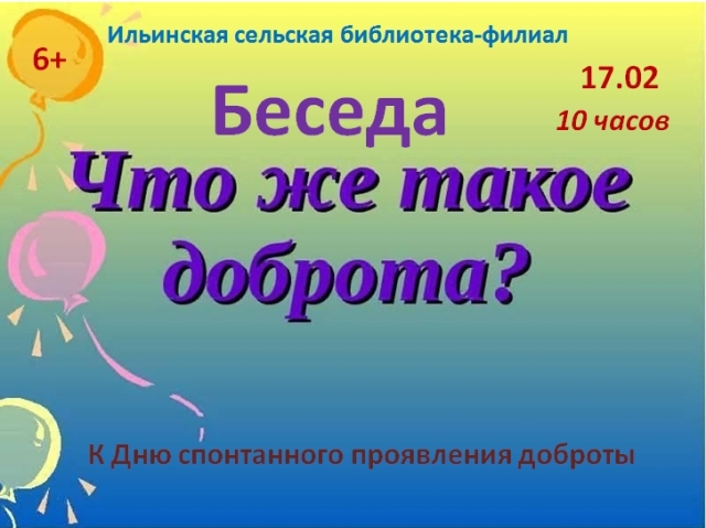 Опубликовано в АНОНСЫ БЕСЕДА «ЧТО ЖЕ ТАКОЕ ДОБРОТА?» Опубликовал iazasniall Опубликовано на 13.02.2026 17 февраля в 10-00 Ильинская СБФ Приглашает на беседу. Автор: iazasniall