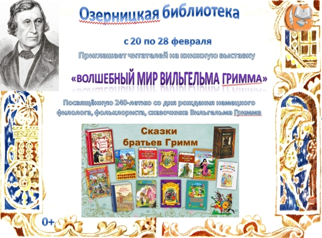 Опубликовано в АНОНСЫ КНИЖНАЯ ВЫСТАВКА «ВОЛШЕБНЫЙ МИР ВИЛЬГЕЛЬМА ГРИММА» Опубликовал iazasniall Опубликовано на 19.02.2026 С 20 по 28 февраля Озерницкая СБФ Приглашает на книжную выставку. Автор: iazasniall