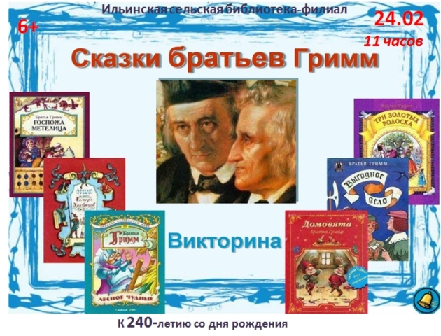 Опубликовано в АНОНСЫ ВИКТОРИНА «СКАЗКИ БРАТЬЕВ ГРИММ» Опубликовал iazasniall Опубликовано на 20.02.2026 24 февраля в 11-00 Ильинская СБФ Приглашает на викторину. Автор: iazasniall