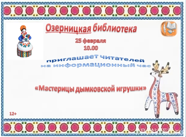 Опубликовано в АНОНСЫ ИНФОРМАЦИОННЫЙ ЧАС «МАСТЕРИЦЫ ДЫМКОВСКОЙ ИГРУШКИ» Опубликовал iazasniall Опубликовано на 24.02.2026 25 февраля в 10-00 Озерницкая СБФ Приглашает на информационный час. Автор: iazasniall