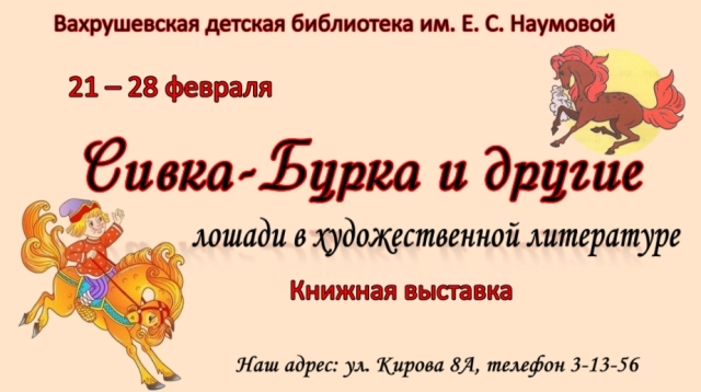 Опубликовано в АНОНСЫ КНИЖНАЯ ВЫСТАВКА «СИВКА-БУРКА И ДРУГИЕ» Опубликовал iazasniall Опубликовано на 24.02.2026 С 21 по 28 февраля Вахрушевская ДБФ Приглашает на книжную выставку. Автор: iazasniall