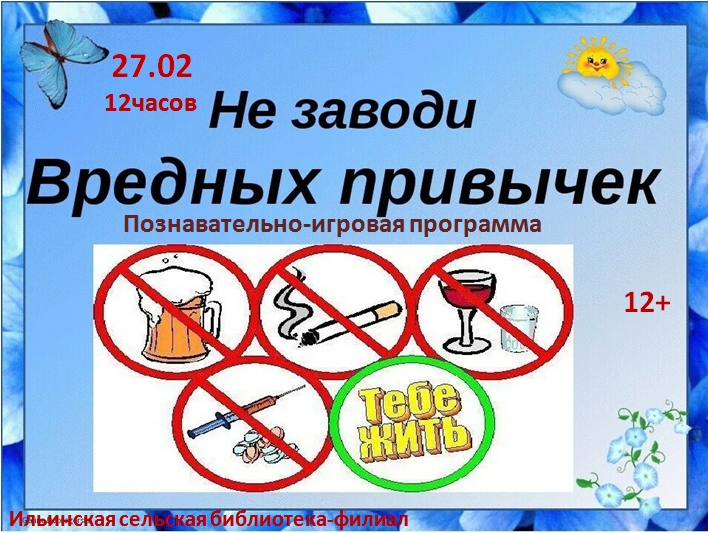 Опубликовано в АНОНСЫ ПОЗНАВАТЕЛЬНО-ИГРОВАЯ ПРОГРАММА «НЕ ЗАВОДИ ВРЕДНЫХ ПРИВЫЧЕК» Опубликовал iazasniall Опубликовано на 26.02.2026 27 февраля в 12-00 Ильинская СБФ Приглашает на познавательно-игровую программу. Автор: iazasniall