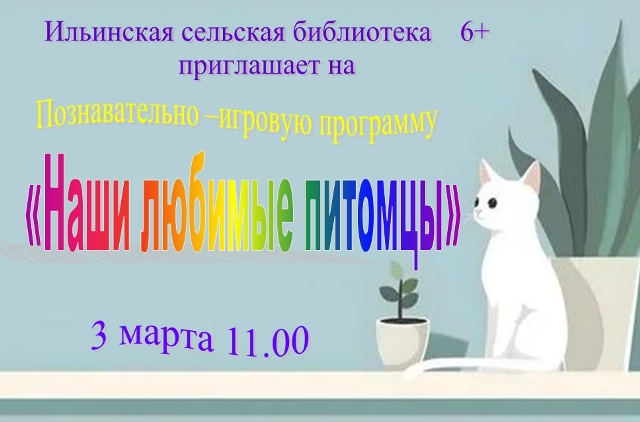 Опубликовано в АНОНСЫ ПОЗНАВАТЕЛЬНО-ИГРОВАЯ ПРОГРАММА «НАШИ ЛЮБИМЫЕ ПИТОМЦЫ» Опубликовал iazasniall Опубликовано на 02.03.2026 03 марта в 11-00 Ильинская СБФ Приглашает на познавательно-игровую программу. Автор: iazasniall